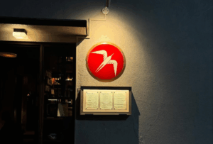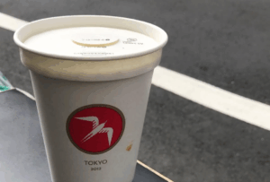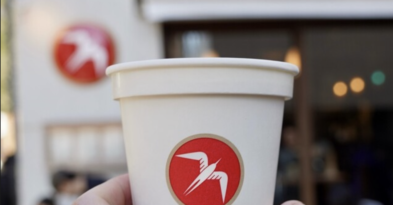 赤い鳥のロゴが印象的な、テイクアウトカップ。