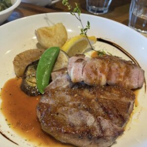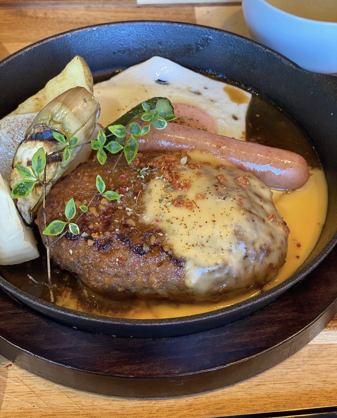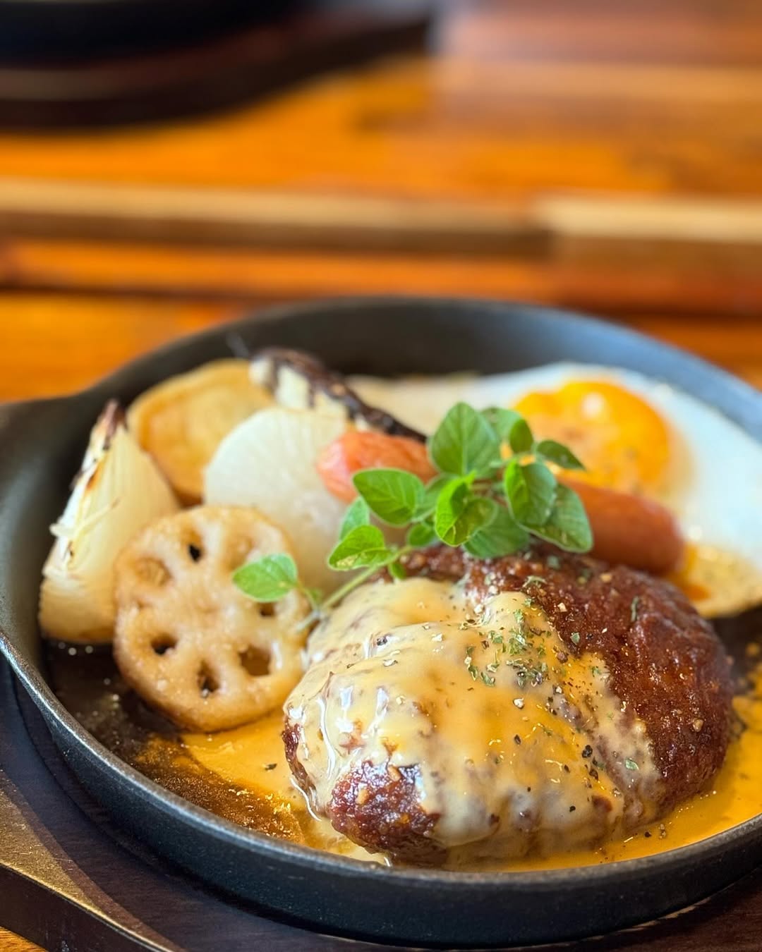 鉄板で焼き上げるジューシーなハンバーグと彩り豊かな地場野菜