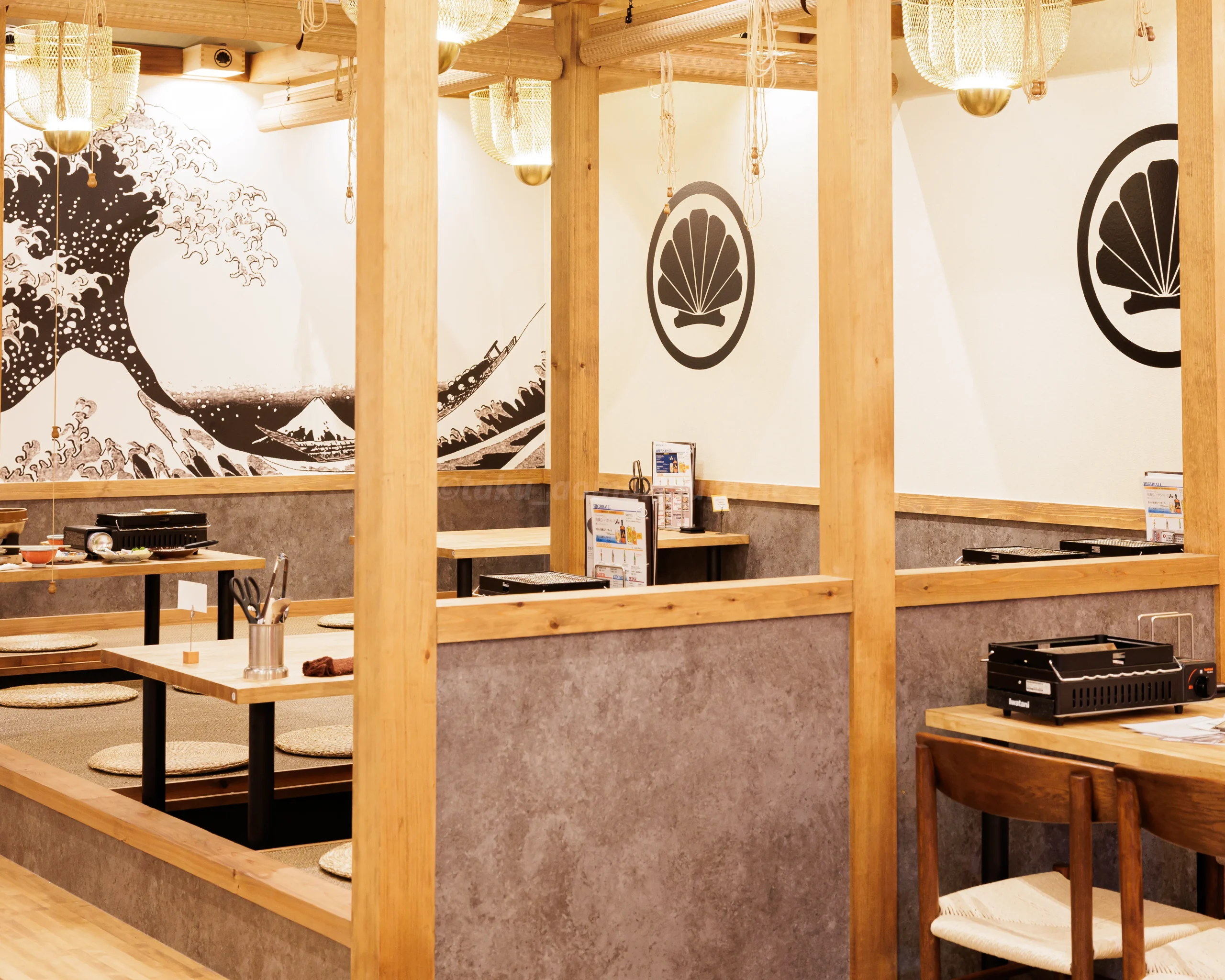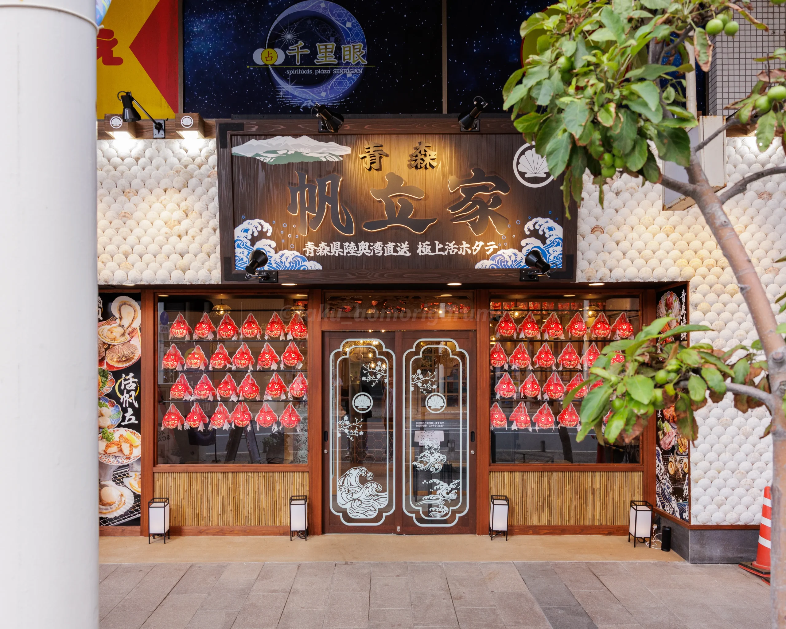 金魚ねぶたが彩る、ホタテの貝殻を敷き詰めた印象的な外観