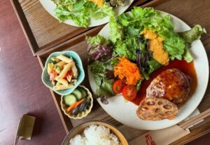 彩り豊かな副菜と手作りハンバーグの健康的なランチ