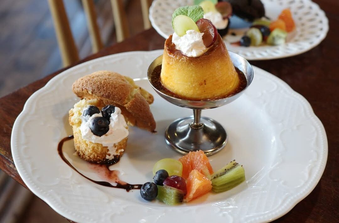季節のフルーツを添えた、贅沢なプリンとマフィンのプレート