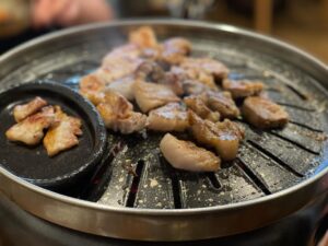 鉄板でじっくりと焼く、新鮮でジューシーなサムギョプサル