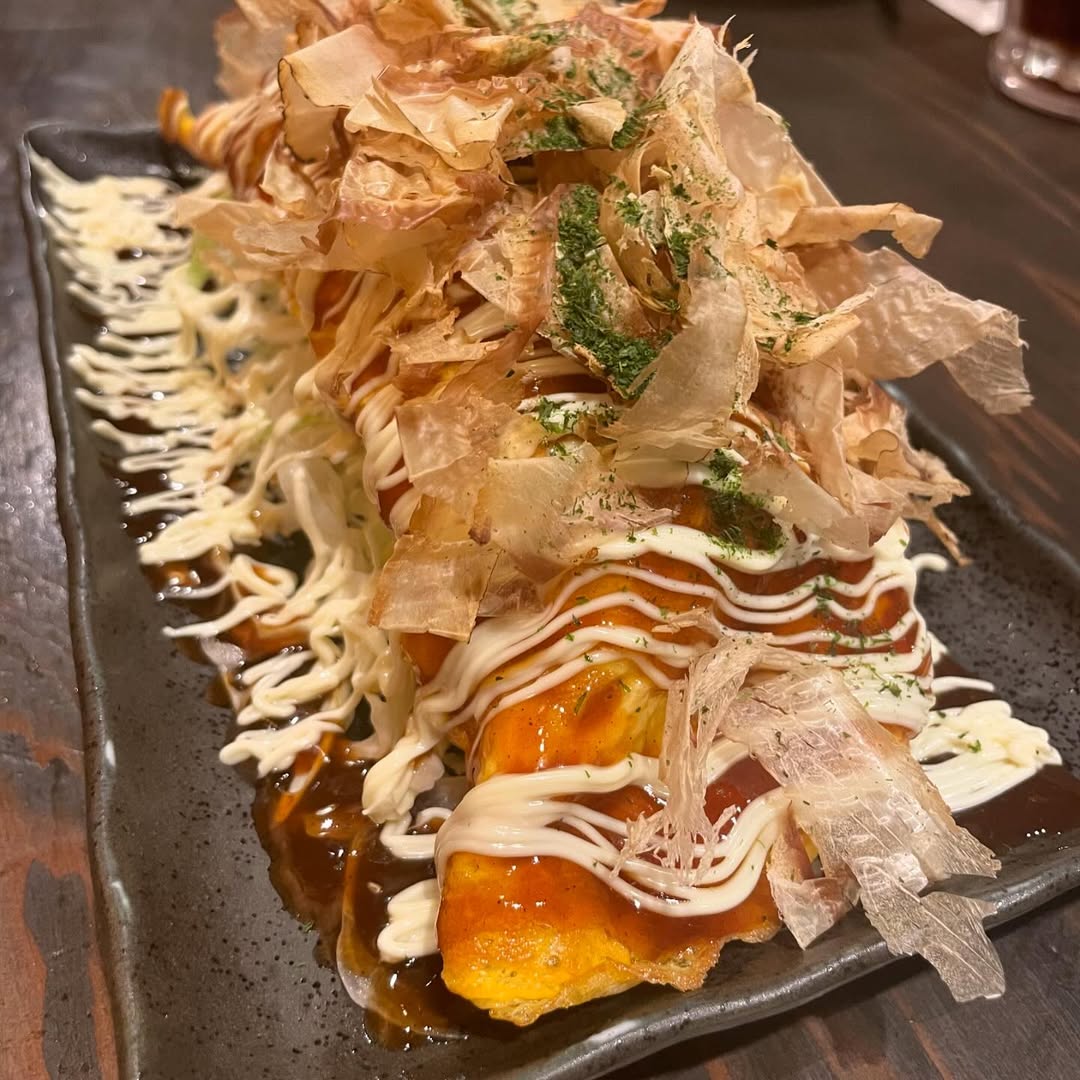 鶏肉とキャベツを玉子で包み、ソースをかけた「とり平焼き」