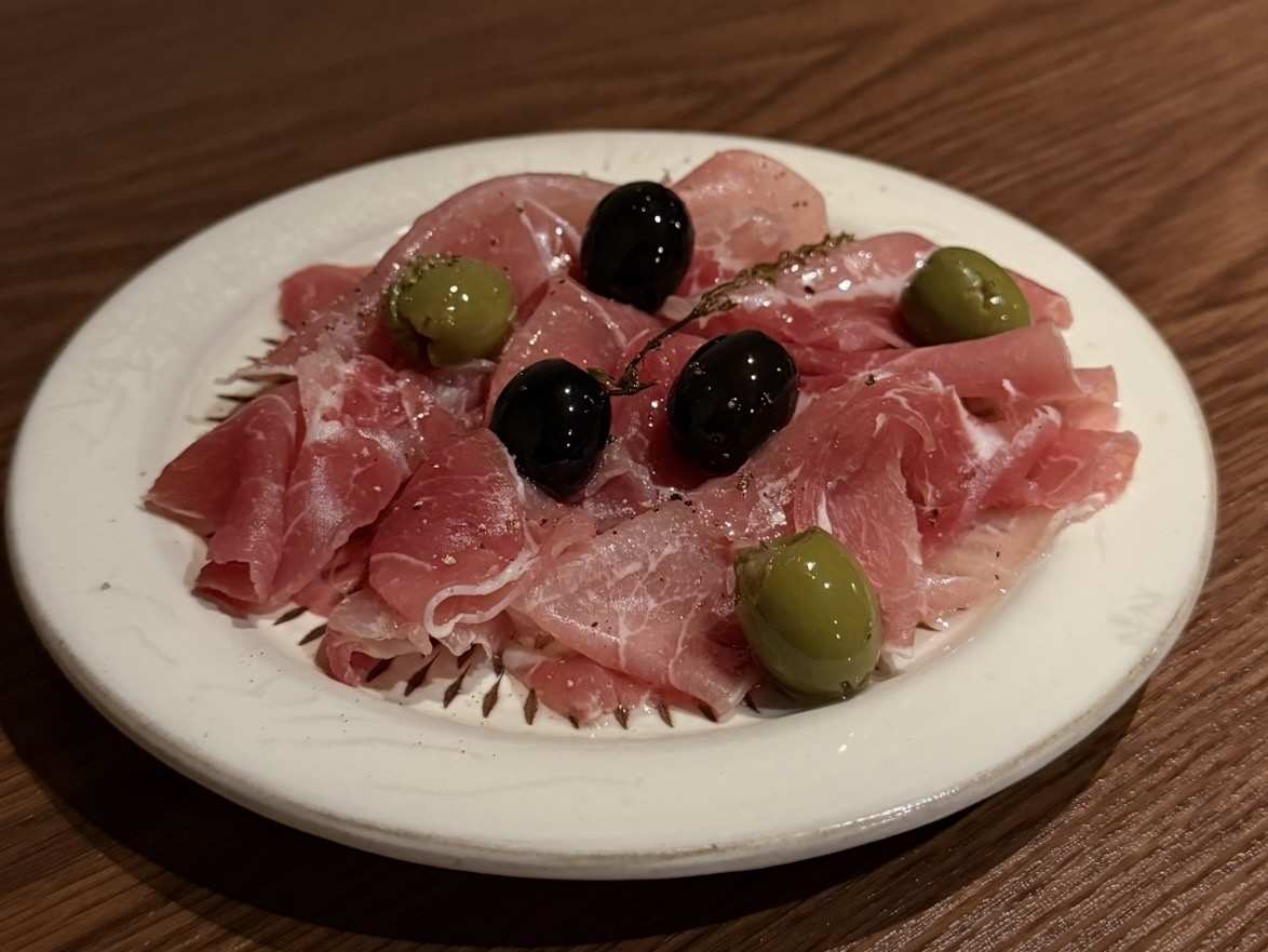 厳選された生ハムとオリーブが並ぶ、ワインにぴったりの前菜