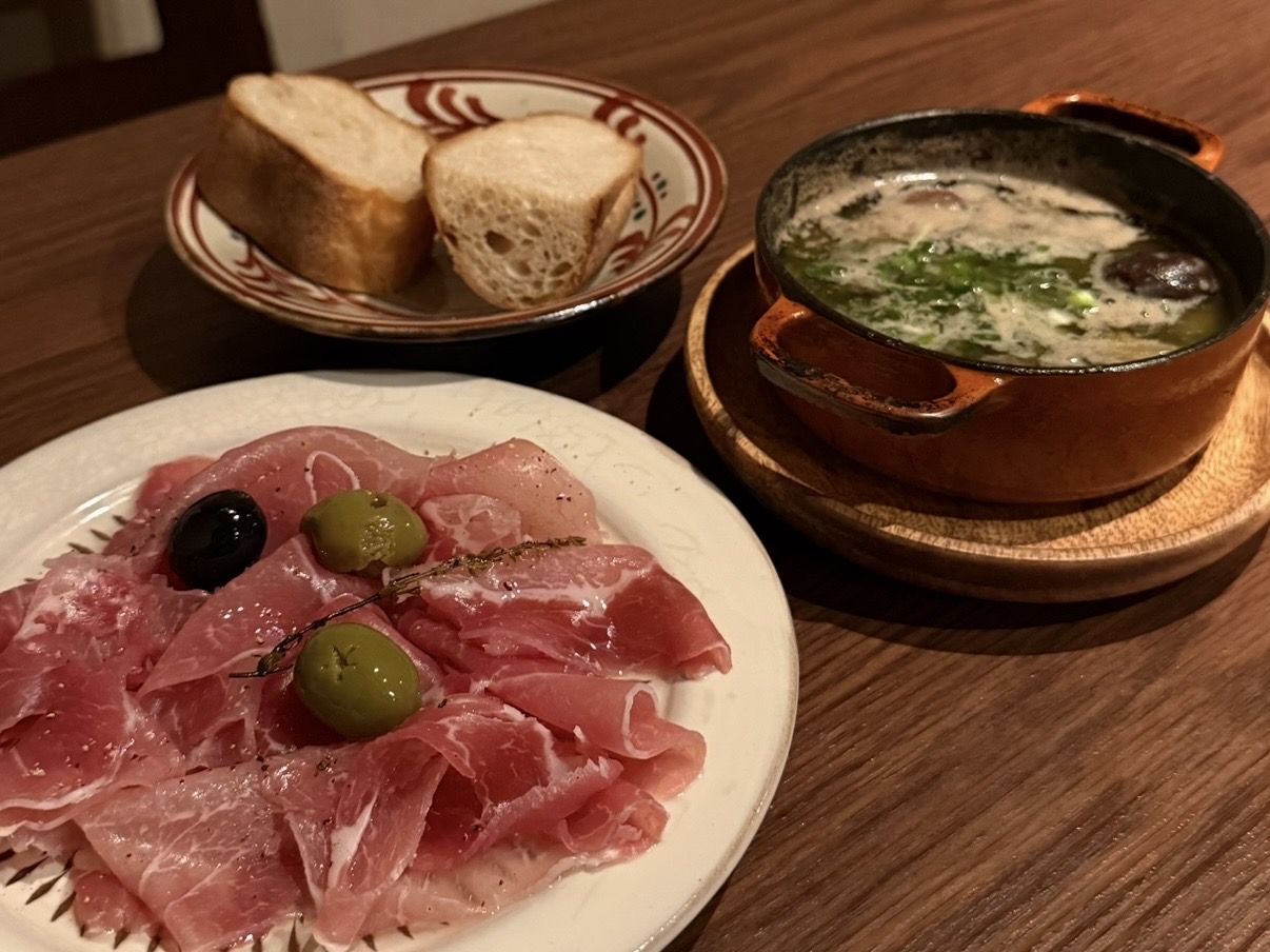 厳選された生ハムとオリーブが並ぶ、ワインにぴったりの前菜