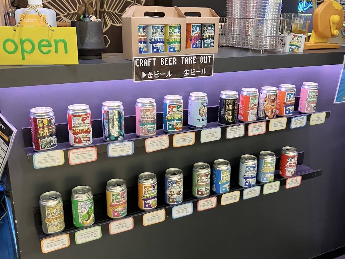 遊び心溢れるデザインのクラフトビール缶が並ぶディスプレイ