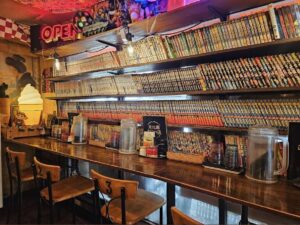 漫画本がずらりと並び、一人でも落ち着けるカウンター席