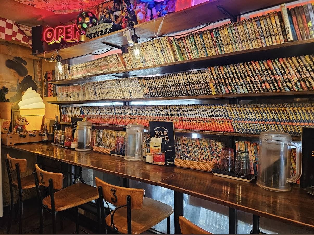 博多区の喧騒を忘れさせてくれる店内には、所狭しと漫画本やフィギュア、昭和のポスターが飾られており、まるでタイムスリップしたかのような遊び心あふれる空間が広がっています。お一人様でも気軽に利用できるカウンター席も完備されており、お好みの漫画を読みながらゆっくりとカレーを堪能できるのもこの店ならではの醍醐味です。
