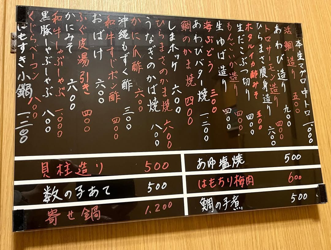 旬の鮮魚や一品料理が並ぶ、その日のおすすめが書かれた黒板。