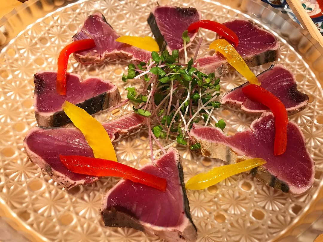 艶やかな赤身と彩り野菜が美しい、分厚くカットされたカツオのたたき。