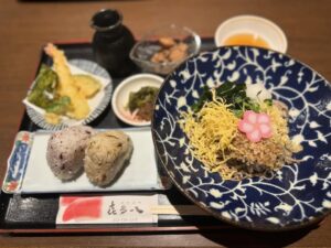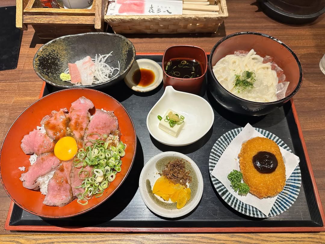 ざるうどんとローストビーフ丼が一度に楽しめるランチセット。