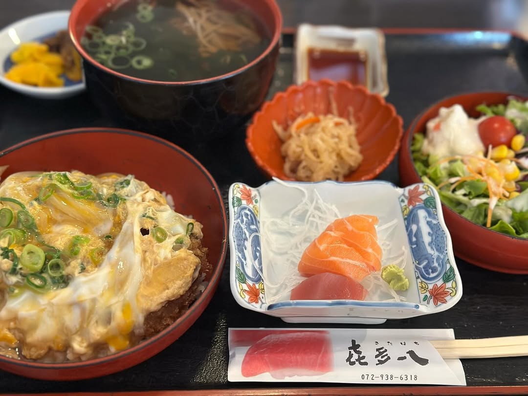 卵でとじたカツ丼に、お造りや小鉢が付いた豪華なセット