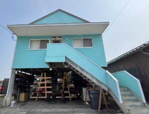 鮮やかなブルーが目を引く海沿いに佇むお洒落な外観