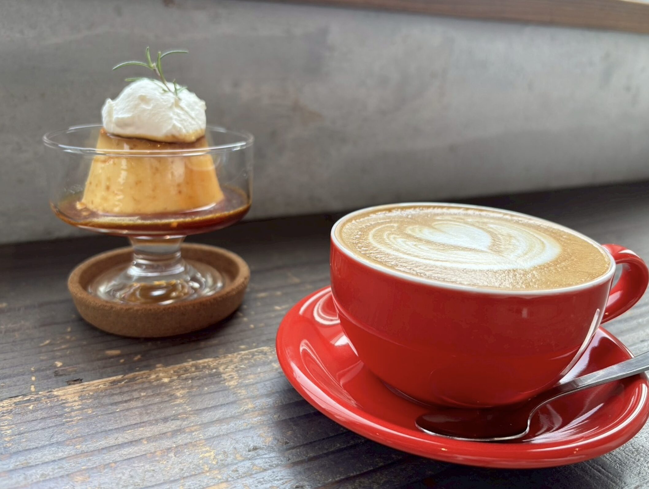 丁寧に淹れられたラテと昔ながらのプリン