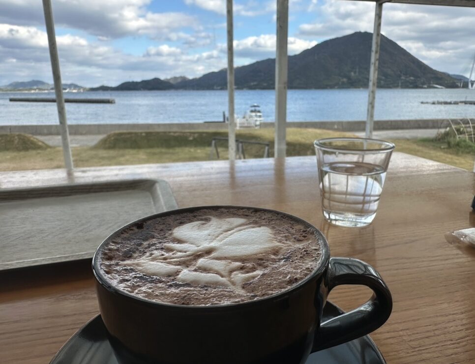海を眺めながら味わう、繊細なラテアートが施された一杯