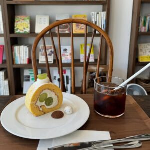 本棚を背景に並ぶ、季節のロールケーキとモンブラン