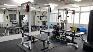 本格的なパワーラックを備えた、清潔感あふれるトレーニングエリア