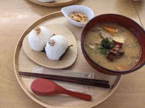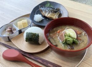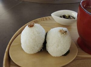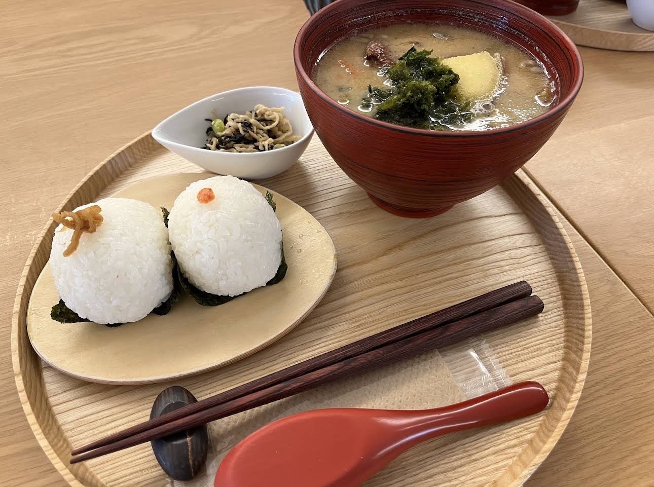 港町の潮風とともに味わう、具だくさんお味噌汁と握りたておむすび。