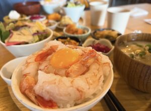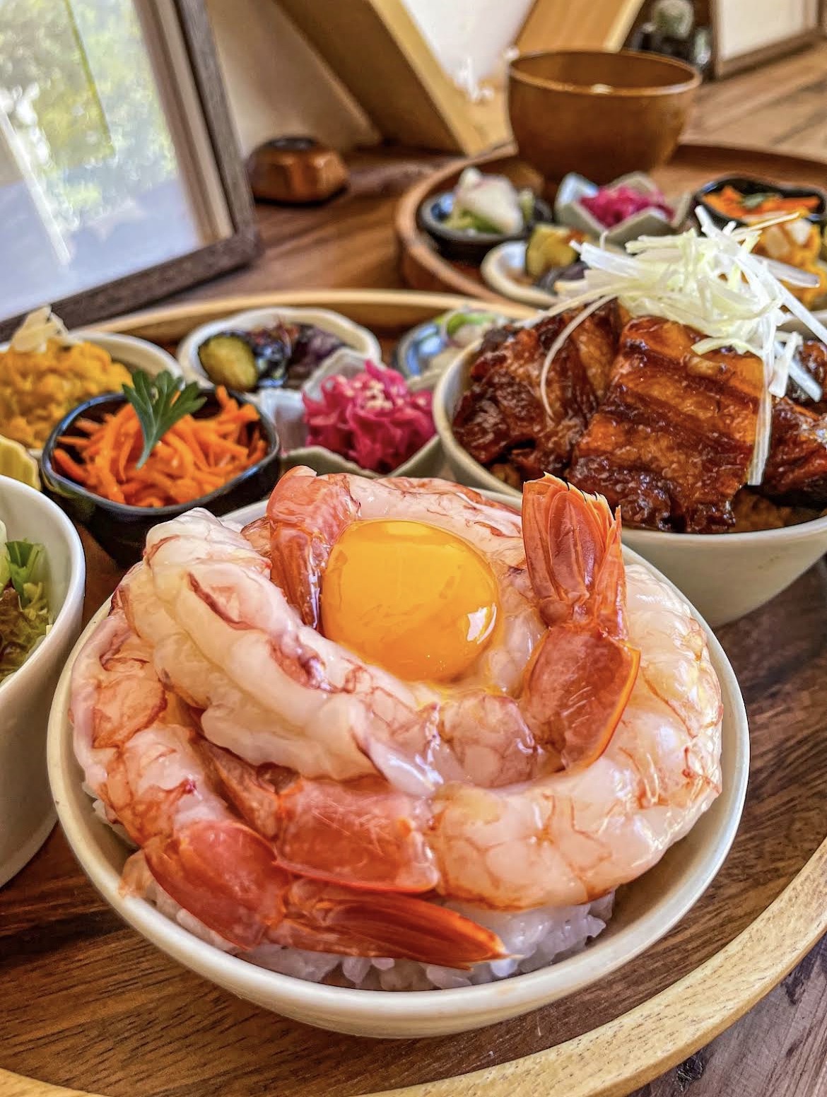 ぷりぷりの海老と卵黄がのった、見た目も鮮やかな贅沢丼。