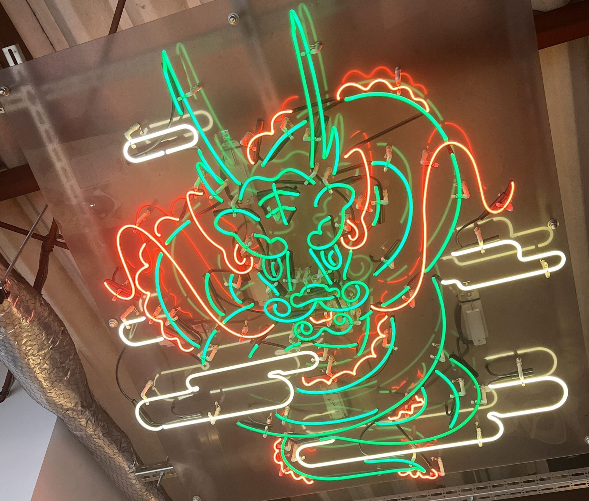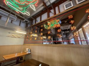 ネオンが光る活気あふれる、カジュアルな店内空間
