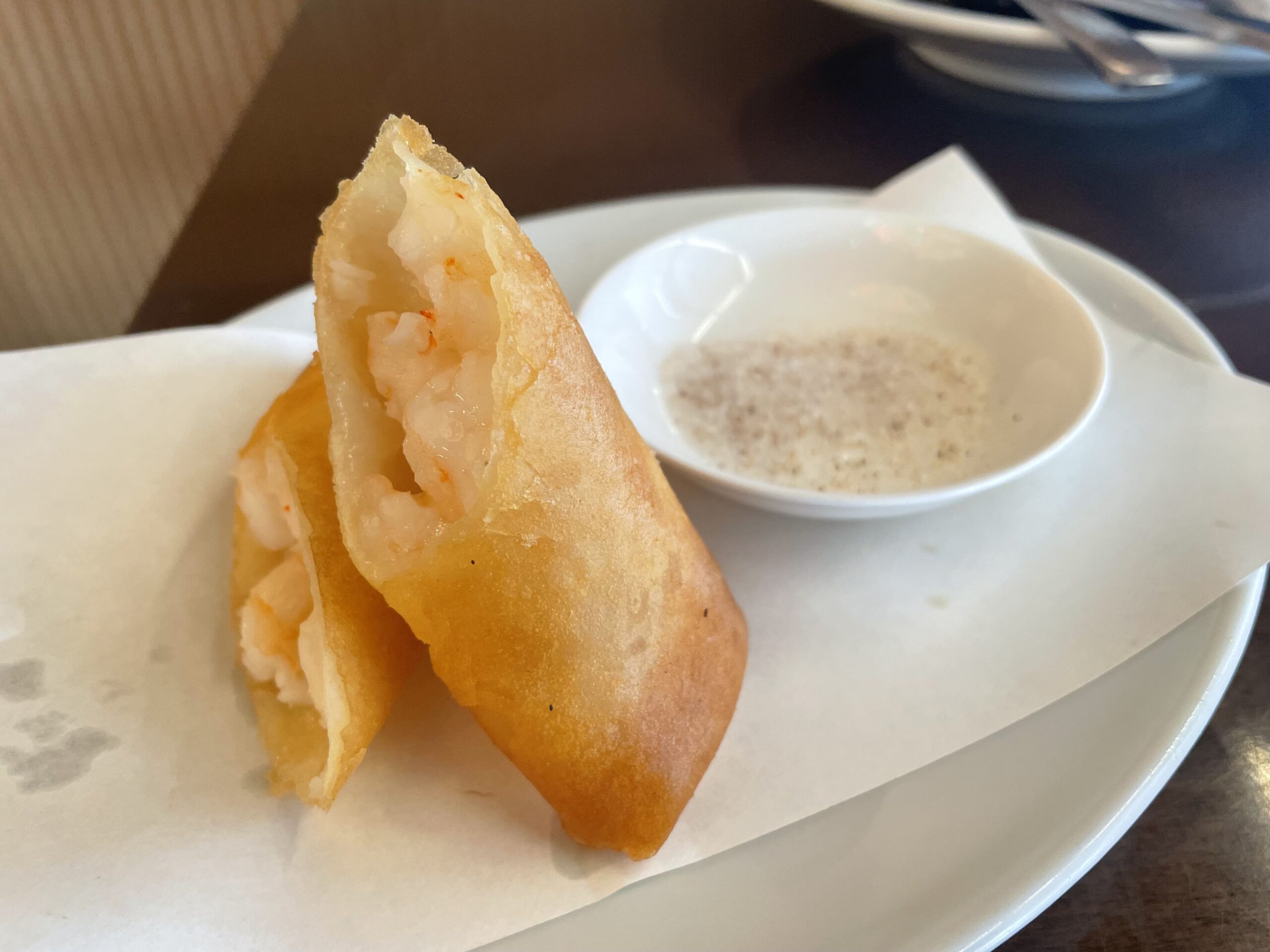 プリプリの海老がたっぷり詰まった手包みの海老春巻き