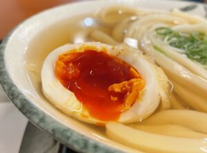 最大の特徴は、噛むほどに小麦の旨みを感じる力強いコシと、滑らかな喉越しを両立させた自家製麺。そして、その麺を優しく包み込むのが、雑味のない透き通った黄金色の出汁です。一口啜れば、深いコクがじんわりと体に染み渡ります。また、サイドメニューの天ぷらも外せません。特に半熟卵の天ぷらは、お花茶屋を訪れる多くのファンが注文する人気の一品で、お箸を入れた瞬間に溢れ出す濃厚な黄身を出汁に溶かして味わうのが醍醐味です。お一人様でも入りやすい落ち着いたカウンター席で、一杯のうどんに込められた職人のこだわりをぜひ心ゆくまでご堪能ください。