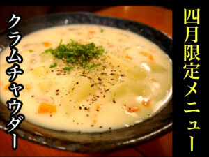 4月限定メニューの「クラムチャウダー」そろそろ入れ替えますので、お早めに👍他の4月限定メニューとの相性も良いです👍