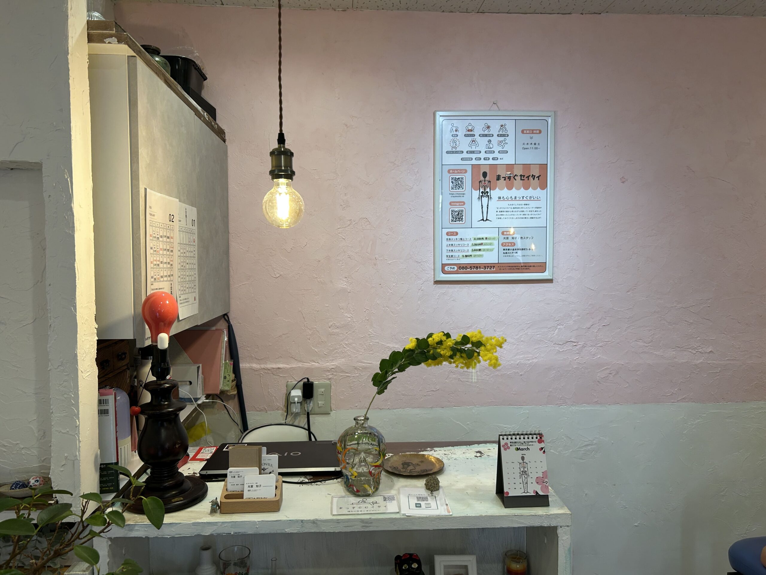 施術では、熟練の手技に加えて温石を使用し、じっくりと体の芯から温めながら筋肉の強張りを解いていきます。東京都小金井市の皆さまにとって、単なる体のメンテナンスの場としてだけでなく、心まで「まっすぐ」にリフレッシュできるような温かい空間づくりを大切にしています。また、印象的な骸骨のイラストをあしらったオリジナルグッズを展開するなど、整体という枠にとらわれない独自のスタイルも魅力のひとつです。