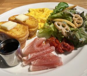 濃厚なスクランブルエッグとフレンチトーストのプレート
