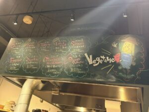 活気ある店内の黒板に書かれた、その日おすすめの野菜メニュー