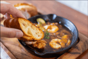 バゲットと一緒に楽しむ、海老の旨味が凝縮された熱々のアヒージョ
