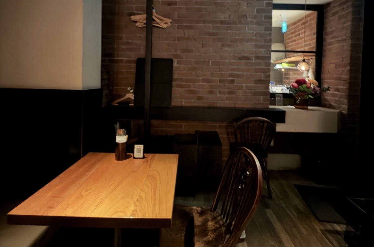 落ち着いた色調の木目とレンガが心地よい温かみのある店内