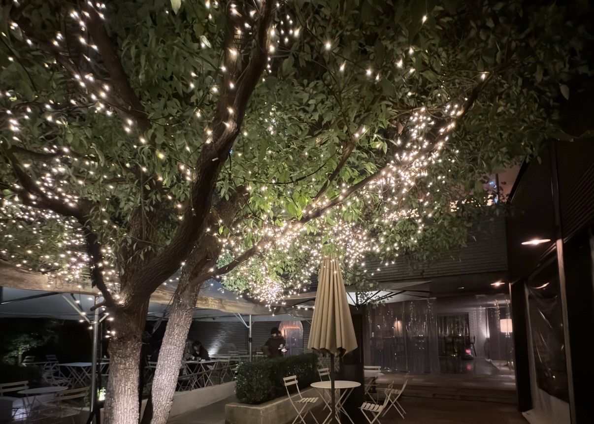 都会の夜を優しく照らす、ライトアップされた美しいテラス席