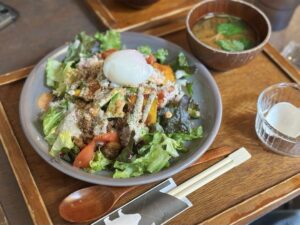 雑穀米と野菜、温泉卵がのったヘルシーで彩り豊かなサラダボウル