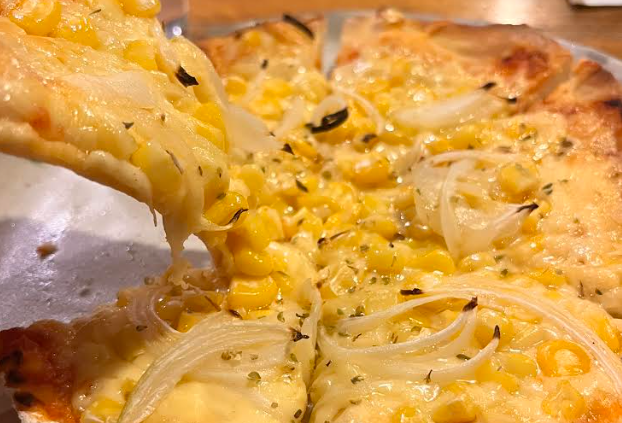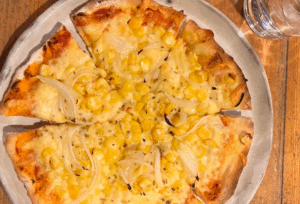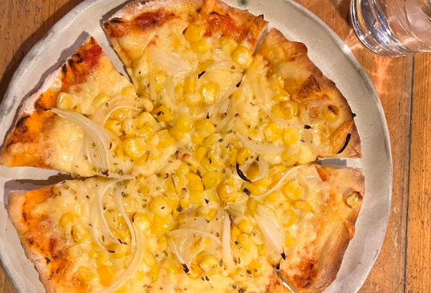 コーンとオニオンがたっぷり乗った、熱々で香ばしい自家製ピザ。