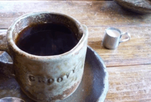 風合いのある陶器で提供される、香り高い本格的なブレンドコーヒー。