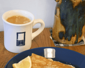 この日いただいたのは、シュガーバタークレープにレモントッピング、コーヒー、キャロットラペとシードル。