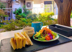 木漏れ日が差し込むテラス席で味わう、手作りサンドイッチと彩りサラダ。