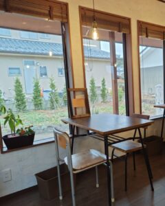 木の温もりに包まれて、ゆったりと過ごせるカフェスペース。