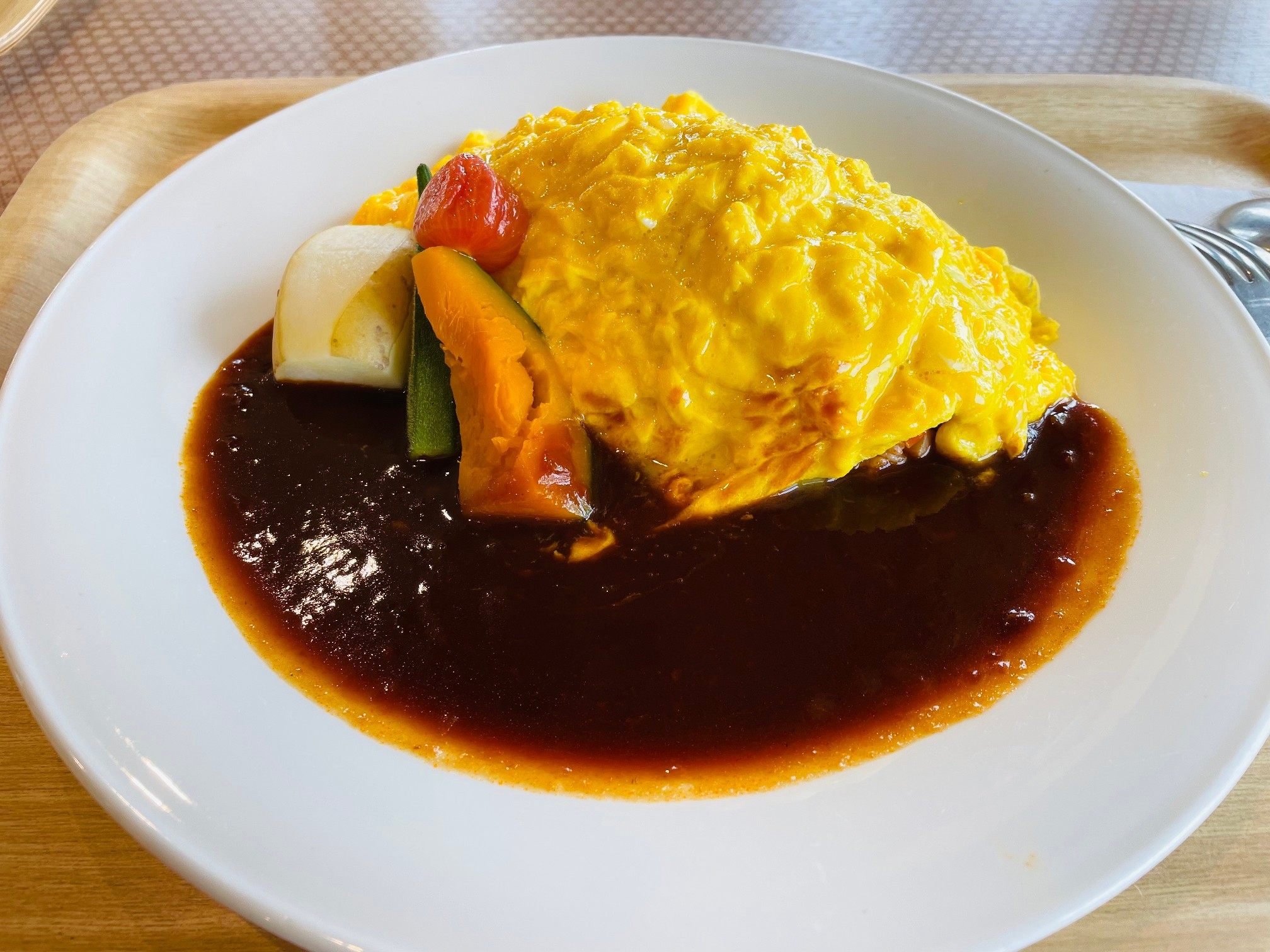 卵をたっぷり使った黄金色のオムライスと彩り豊かな添え野菜