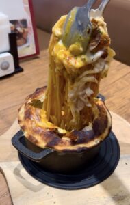 熱々の器から溢れ出すチーズとソースは、まさに溶岩のよう!フォークを持ち上げると、濃厚なチーズとソースがパスタにしっかり絡み、食欲をそそる香りが広がります。一口食べれば、お腹の中からポカポカと温まっていただけること間違いなしです。